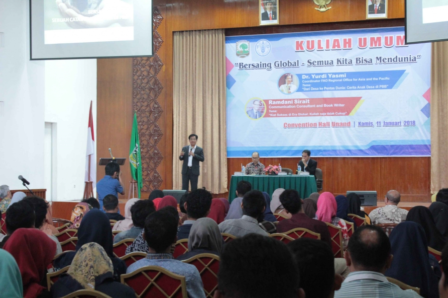 Kuliah umum ini mengusung tema “Bersaing Global-Semua Kita Bisa Mendunia” bersama Dr. Ir. Yurdi Asmi, MSc (Coordinator di Food and Agriculture Organization (FAO) Regional Office for Asia and the Pacific) dan Ramdani Sirait, Communications Consultant & Book Writter yang dibuka secara resmi oleh Wakil Rektor III Universitas Andalas Prof. Dr. Ir. Hermansah, MS, MSc.