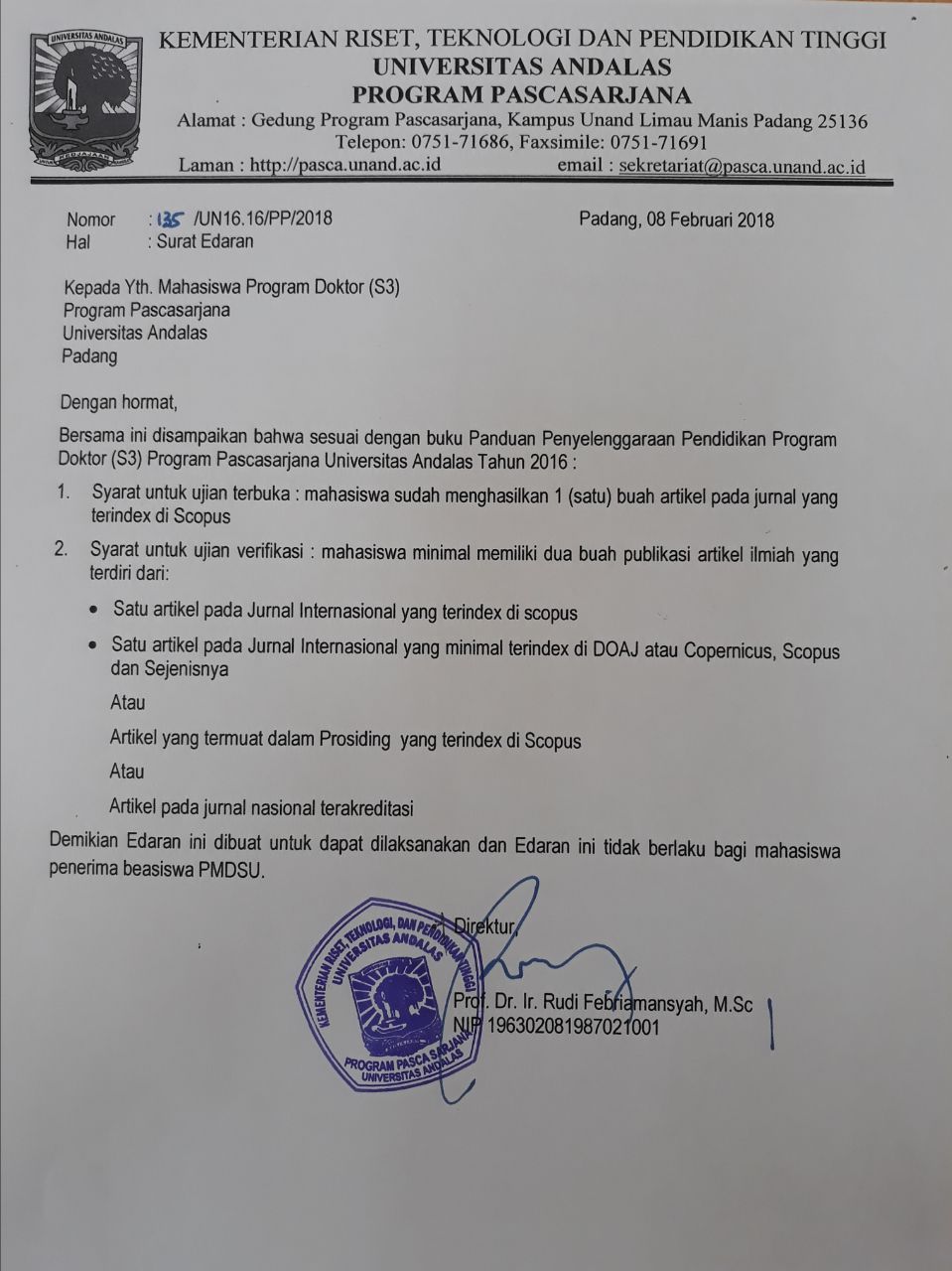 Bersama ini disampaikan bahwa sesuai buku Panduan Penyelenggaraan Pendidikan Program Doktor (S3) Program Pascasarjana Universitas Andalas Tahun 2016 :