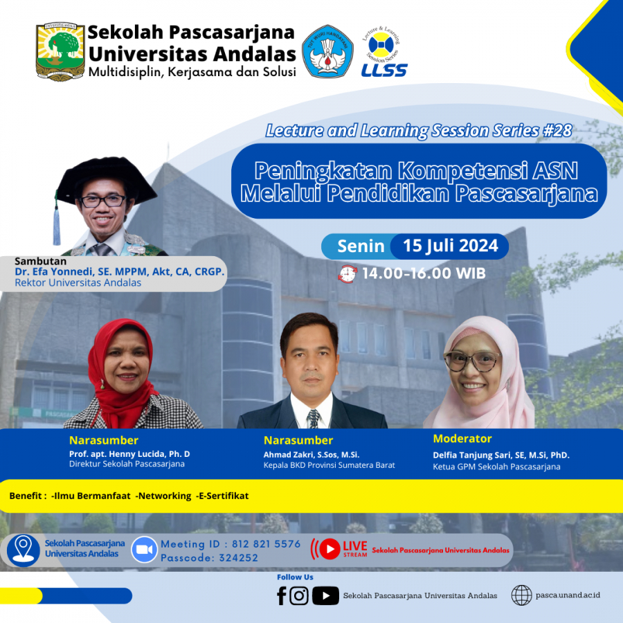 Sekolah Pascasarjana Universitas Andalas menyelenggerakan kegiatan Lecture and Learning Session Series #28 dengan tema Peningkatan Kompetensi ASN Melalui Pendidikan Pascasarjana. LLSS ke #28 ini dapat memberikan informasi terkait pengambangan potensi diri, khususnya kompetensi ASN melalui pendidikan Pascasarjana. Kami menghadirkan narasumber kompeten di bidangnya pada :