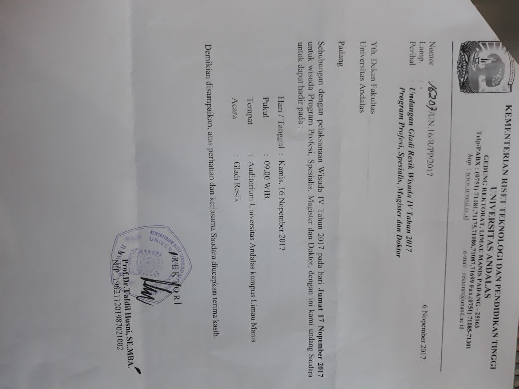 Sehubungan dengan pelaksanaan Wisuda IV Tahun 2017 pada hari jum'at 17 Nopember 2017 untuk wisuda Program Profesi, Spesialis, Magister, Doktor, dengan ini kami mengundang saudara untuk hadir pada :